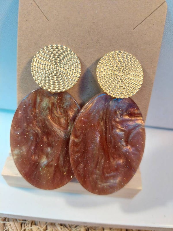 Oorbellen rvs goud met bruine hanger met glitters