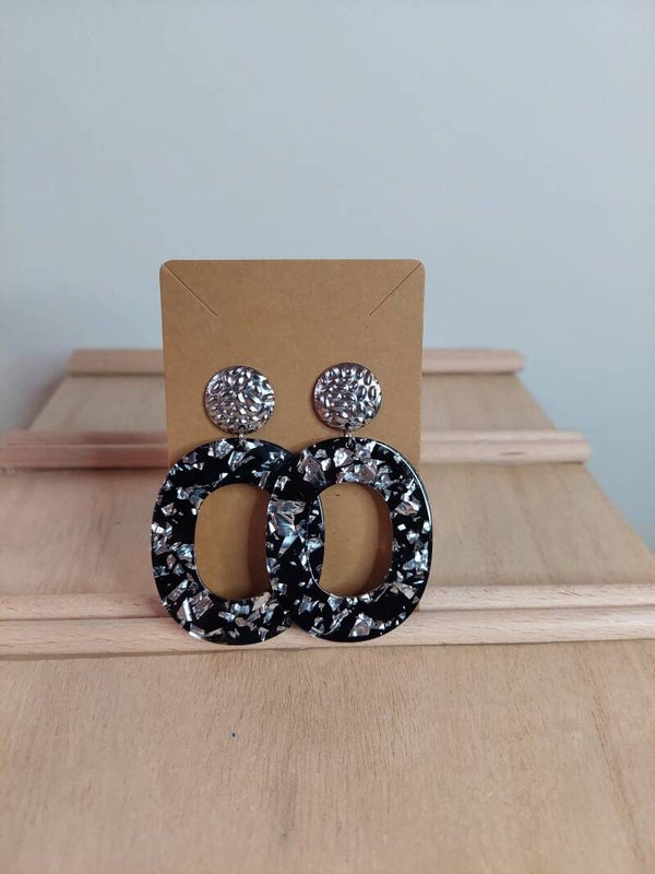 Oorbellen RVS zilverkleurig met zwart en zilverkleurige resin hanger